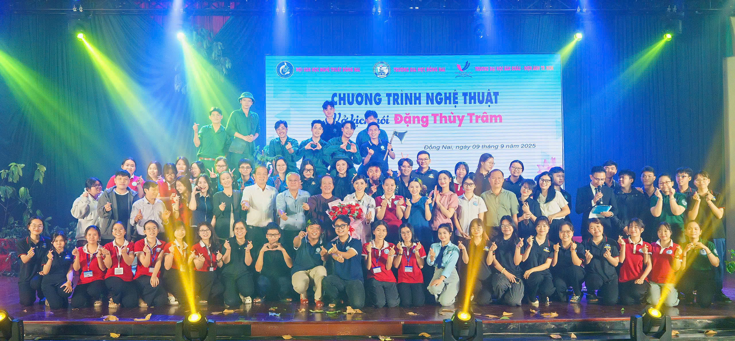 Lãnh đạo, Văn phòng Hội VHNT Đồng Nai, Ban Giám hiệu và sinh viên trường Đại học Đồng Nai chụp hình lưu niệm cùng các diễn viên tại Chương trình nghệ thuật vở kịch nói Đặng Thùy Trâm.